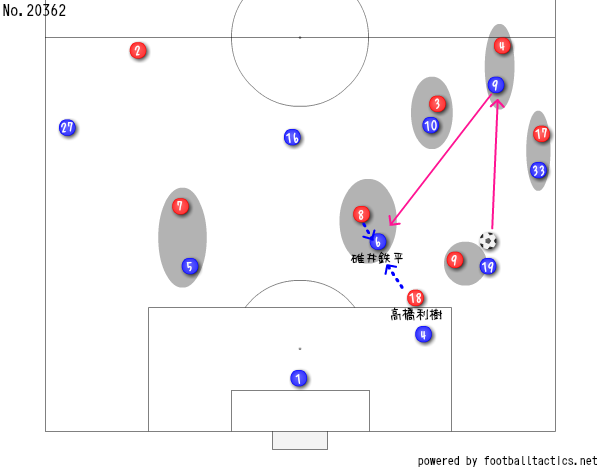同数で激しくプレスにくる熊本に対して、ぎっしりと人数をかけて圧縮されたとこにカターレは無理につなごうとしたところで、まんまとやられてしまったがやね。