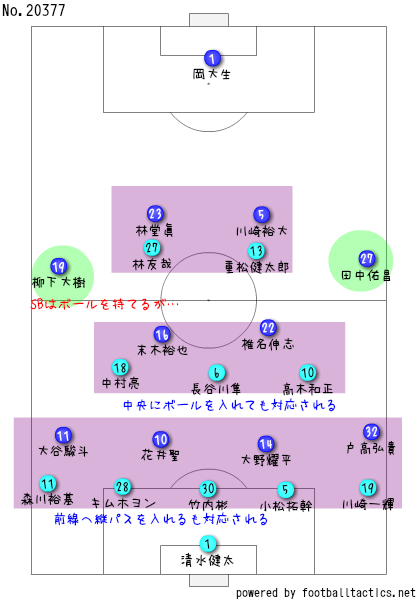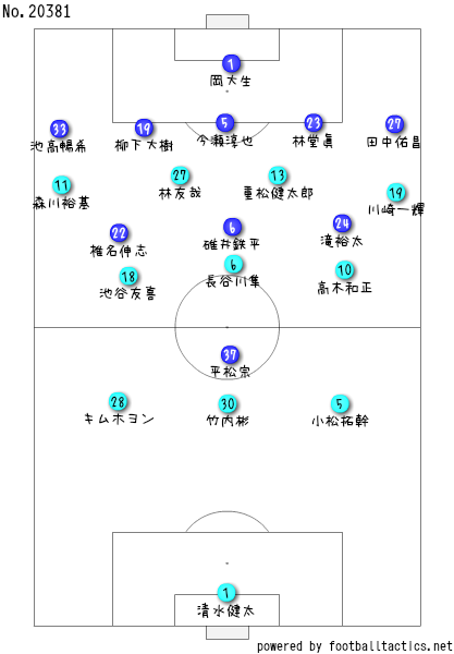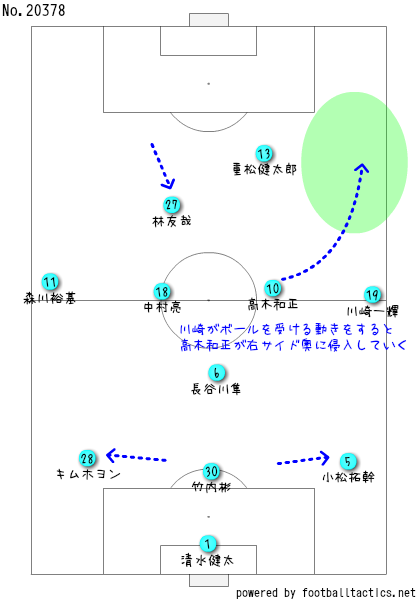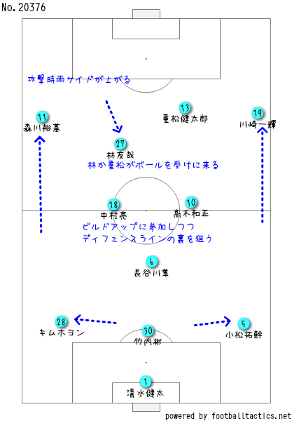 攻撃時は両ウイングバックの森川裕基と川崎一輝が上がってくるがで、4トップのような形を取ってくるがいど、2トップの林が下がってボールを受けに行くのと同時に、中央の高木和正と中村亮が裏を狙ったりと、飛び込む選手を入れ替えながら攻めてきとったがやね。