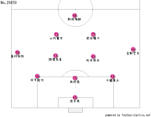セレッソは毎年4-4-2やったがいど、監督が代わったこともあって、フォーメーションは代わっとるちゃね。この試合に先発する出場選手のデータを見た感じやと、田平、島村、松本、吉馴、岡澤が10試合以上出場しとんがやね。