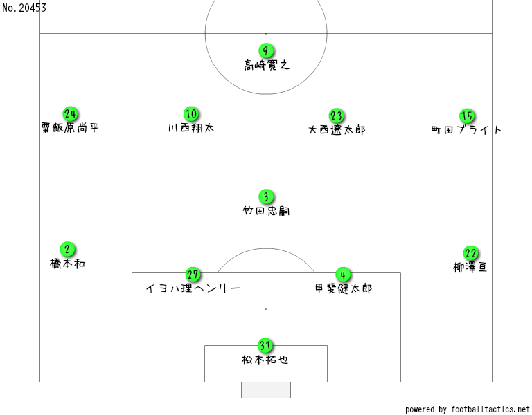 直近の長野戦のシステムは4-1-4-1ながやね。本職CBの竹田忠嗣がアンカーをやって、両CBが甲斐健太郎とイヨハ理ヘンリーのコンビ、攻撃陣は両サイドが粟飯原尚平と町田ブライトでよぉ、トップ下に川西翔太で、1トップに高崎寛之ながやね。