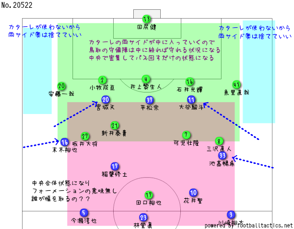 実際に3-4-3にシステムを変えたところで、結局はサイドの選手も中に入ってしまうがで、結局やることが一緒やったのう。前節鳥取と対戦した今治は、この水色のスペースをどんどん突いていったがやけど、カターレには微塵として感じさせられなかったじゃ。