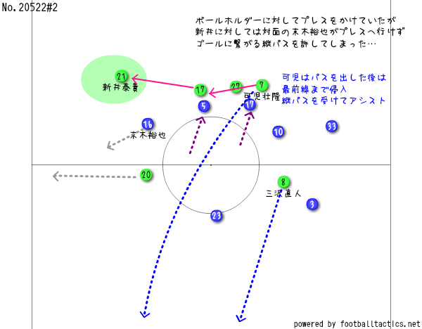 先制点を許す前の展開やけど、これは非常に残念やちゃね。ゴールキックの後の展開やったがいど、田口のマークについていた今瀬が引きずり出されたところで、ボールホルダーに対して、プレスを続けんなんとこやったがやけど、新井にボールが渡ったところで、末木がプレスへ行けんかったがやね。この状況下では縦パスを入れられてしまうちゃ。