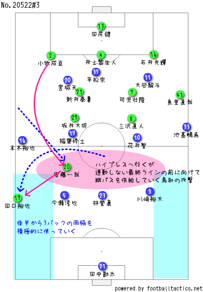 対する鳥取に関しては、前半は守備から入って「まずは失点しない」というところから入ったのう。これはカターレがラインを上げてくるとの見て、左のタッチライン際にポジションを取る魚里とか、裏抜けを狙う田口裕也、またはカターレの最終ラインとボランチの間を狙う三沢と坂井に供給していくプランやったのう。前回対戦時のハイプレス…という感じやなかったのう。