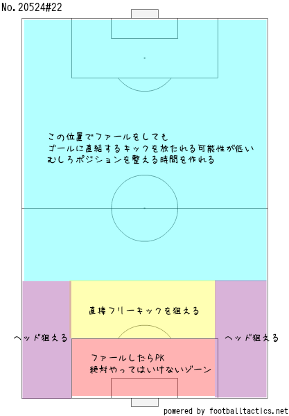 このポジションでファールをしたところで、プレーが止められるがいど、守備側にとっては、守備陣形を整える時間を作れるしよぉ、不用意な形でボールを奪われた際には、すかさずファールで止めておくほうが効率的やちゃね。即失点に繋がりそうなカウンターの場合は、即相手の足を引っ掛けたり、手で押したりするほうが有効やちゃね。理屈がそうなっとるちゃ。