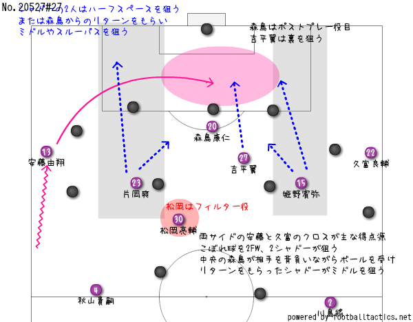 そんで中央には元日本代表でJ3屈指のフィジカルプレーヤーである「デカモリシ」こと森島康仁がおって、彼が相手DFを背負ったり、引きつけとるときに、スペース(裏のスペースやハーフスペースなど)の中に大石治寿や吉平翼、姫野宥弥らが狙っていく…という感じながよ。