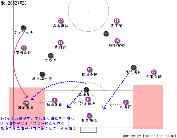 前節の藤枝の相手である鹿児島ユナイテッドFCはよぉ、その藤枝の3バックのシステムを利用して、CFの酒本憲幸がどんどん侵入しとったがやね。そこで深い位置を取ってから攻撃の起点を作っては、チャンスを多く作っていたのう。
