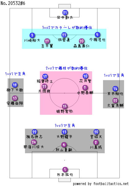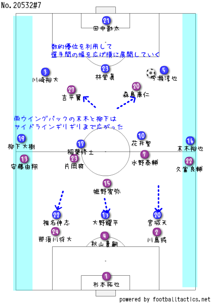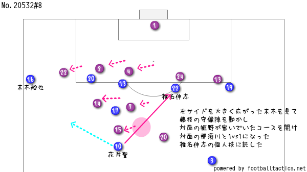 ゴールを決めた椎名が見事やったがいど、密集している状況やったら、椎名が一人でどうにかできるわけではないちゃ。「ワイドに広がることによって、中央で勝負しやすい状況を作る」というのが、このゴールを表すには丁度いいやろう。