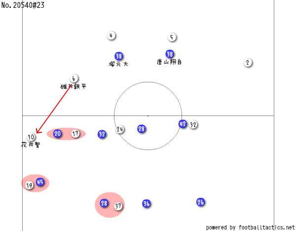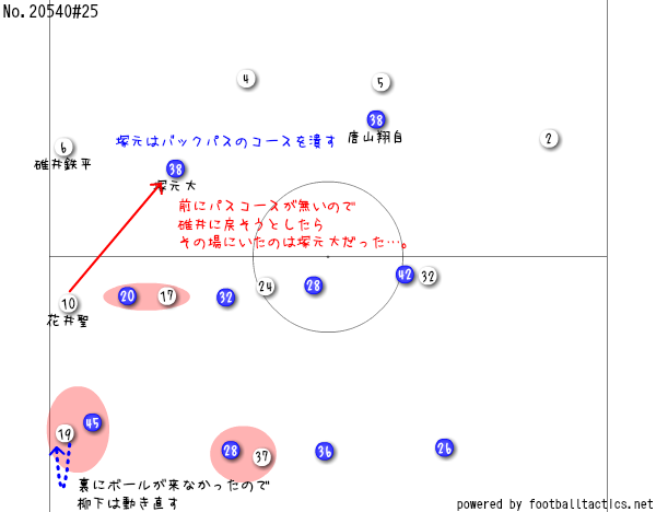 これが花井さんがよぉ、パスを受けたときの碓井のポジションに蹴ったがやね。そこには碓井やなくて、相手のキープレーヤーである塚元大がおったわけやちゃ…。