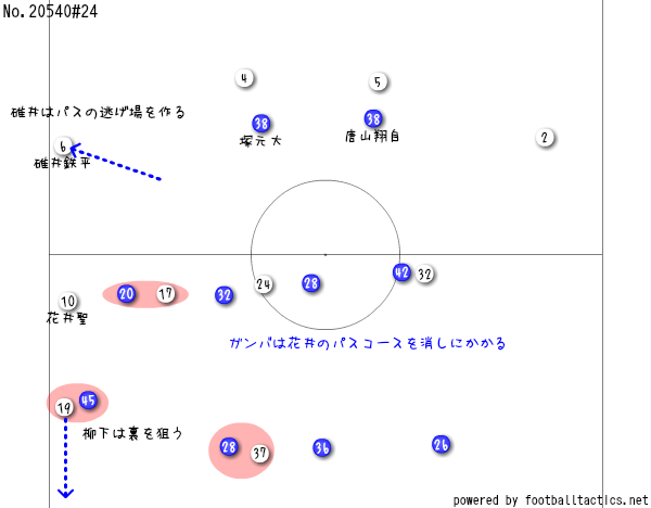 前列に移動していた柳下としては、花井のパスを信じて裏を狙っていったがやね。他の選手はパスコースを作ろうとステップでズラそうとしたがいど、ガンバの守備陣はパスコースをガッチリ潰したがいちゃ。