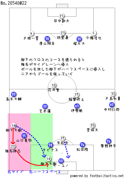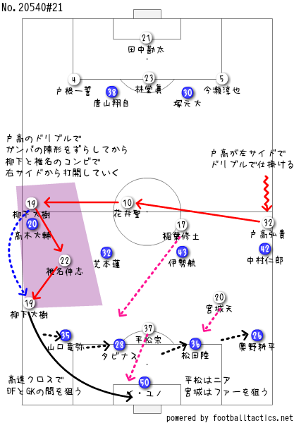 そんでクロスを警戒されてきたら、今度は椎名がサイドに開いて、椎名のクロスから、柳下がニアに飛び込んでいく攻撃も見せてきたじゃ。椎名と柳下が2つのレーン(ハーフスペースとタッチライン際)を入れ替えることによって、ガンバの守備陣を翻弄してきとるがやね。