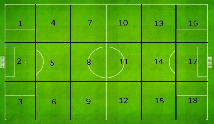 「14ゾーン」というのは、日本で言われる「バイタルエリア」のことやけど、イングランドではこう言われとるがやね。敵味方陣地の両方に縦横の線を2本ずつ入れて、自陣の上から数えていくと「バイタルエリア」に当たるところが「14ゾーン」と言われるながいちゃ。