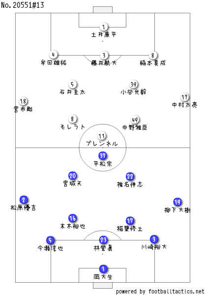 この日のスタメンはGKが岡大生に戻って、3バックが今瀬、林堂、川崎の3人でよぉ、ウイングバックが左に松原、右に柳下、セントラルハーフが末木と稲葉のコンビで、今回は花井が外れたじゃ。1トップが平松、2シャドーが宮城と椎名やちゃね。