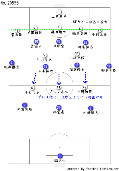そんな引いて戦う岩手に対してカターレがやったのは、ひたすらロングボールを蹴っていくことやったがやね。これをすることで、相手が更に下がって、中盤でスペースを作ろうとしていた…というのが、試合後の安達監督のコメントには書いてあったのう。