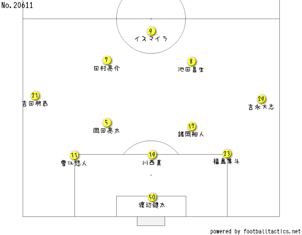 前節の相模原戦のスタメンやけど、GKがファンティーニ燦から渡辺健太に代わっとって、守備陣も3バックになっとんがやね。中盤はおなじみの諸岡裕人に、両サイドが吉永と吉田の2人、3トップが不動のイスマイラ、田村亮介、池田昌生の3人ながやね。