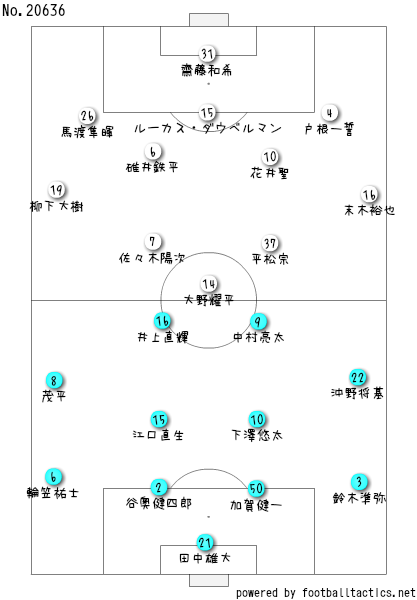 カターレは前節とはメンバーがちょこっと変わっとるちゃね。3トップはそのまま、セントラルハーフは花井と碓井のコンビで、両サイドが左に末木で右にヤギやちゃね。注目は守備陣やけど、ジュンキはそのままで、戸根がスタメン復帰でよぉ、中央には久々のルーカスに、GKは第3節以来の齋藤和希やちゃね。