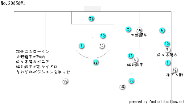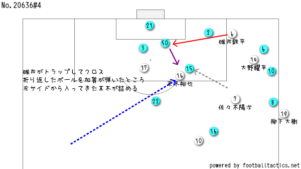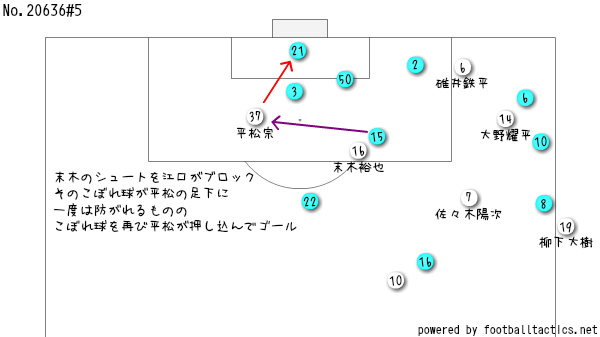 そして加賀が触れたボールに末木が詰めたところで、江口に防がれるがいど、そのボールがファーサイドに流れた平松の足下に入って、シュート…という流れやちゃね。平松も一発で決めたかったところやけど、まあブラウのタイトな守備陣相手には、こういう一瞬のプレーでゴールに繋がるかどうか直結するもんやちゃね。