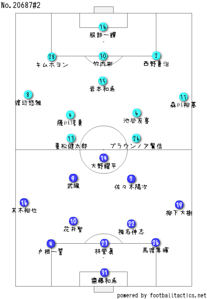 対する讃岐も前節と変わったところは、右ウイングバックに渡辺悠雅が入って、薩川淳貴が1列前へ移ったのう。