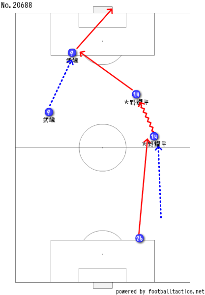 讃岐のスローインからスタートしたがやけど、そこで大外の選手からのパスをボールを受ける選手が空振りしたところで始まったがやね。そのボールをジュンキが一気にグラウンダーで縦パスを通すとよぉ、大野の足下に入って、大野のスルーパスから、武颯が抜け出して、相手GKとの1vs1を制して、カターレが先制点を決めたじゃ。
