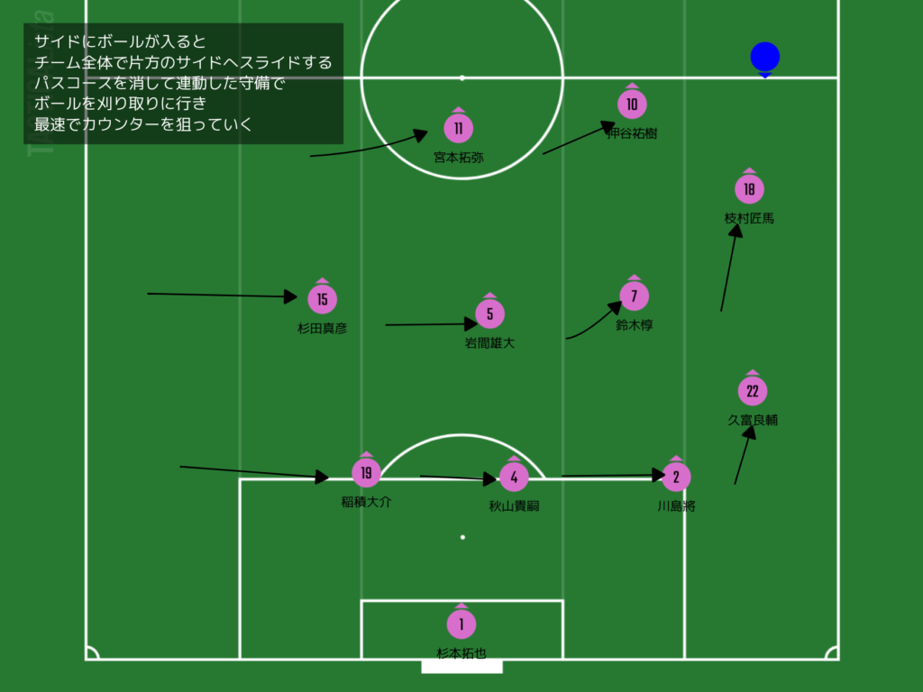 ただ、ボールに合わせて、スライドを徹底してやり続けることをしとったら、片方のサイドにボールが入ったときにスペースが大きなスペースが生まれるがやね。