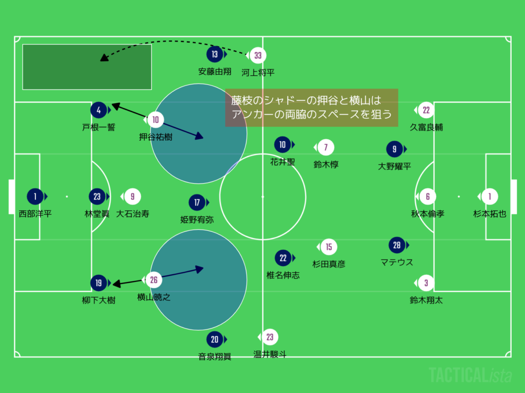 そんでよぉ、このシステムの利点である両ウイングバックが両サイドをポジション取ることで、よりワイドな攻撃ができるようになってきたがやけど、その役割を左は温井駿斗と鈴木翔太のコンビ、右は河上将平と久富良輔が担う形になってきとんがやね。CHの杉田真彦が下がって組み立てることによって、3バックのサイドも攻撃参加していく…という形を取るがやね。