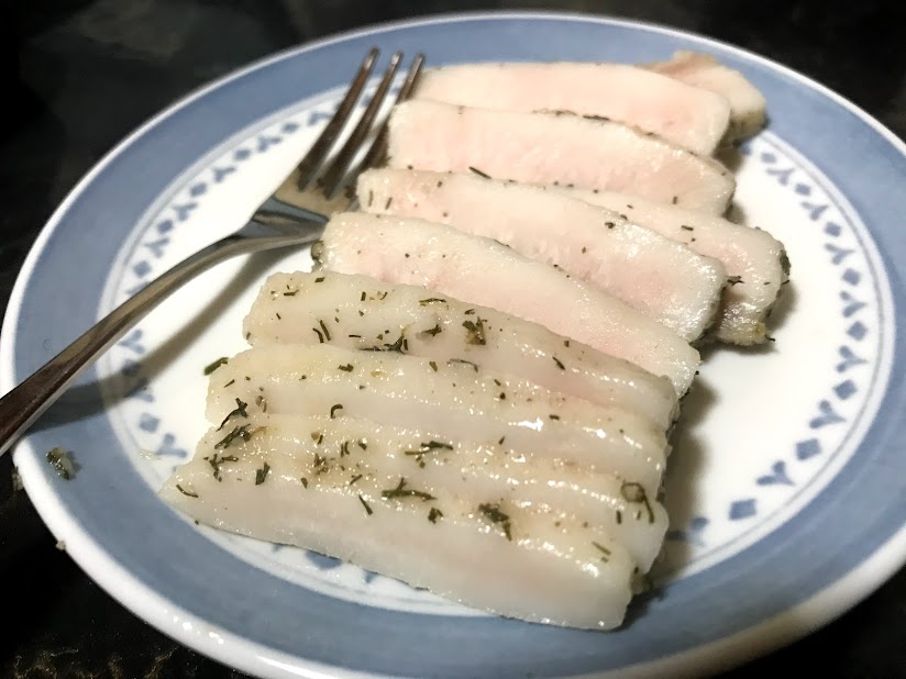最近はトルコ料理ばっかしハマっとったがいど、その近辺の料理も好きながいちゃ。ウクライナ料理といっちゃ、「ボルシチ」「チキンキエフ(カツレツ)」「ヴァレニキ(ウクライナの餃子)」といったところが有名ながいど、伝統的によく食べられとるのが、豚の塩漬け「サーロ」やちゃね。