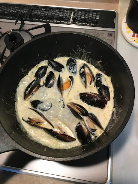 ムール貝を入れてよぉ、蓋を閉めて蒸していくがよ。ムール貝が開いてきたら蓋を開けるちゃ。最後は塩コショウで味付けしたら完成やちゃね。