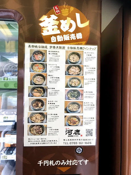 この自販機のいいところちゃ、早朝で店がやっていない時間帯でもよぉ、この自販機があれば、食べ物には困らないということながよ。特に始発でトロッコに乗るお客さんにとっちゃ、この釜飯自販機は本当に助かるがよ。トロッコの中で食べるなり、鐘釣駅や欅平駅到着後などで食べるなりできるがで、好評を得ているみたいやちゃね。