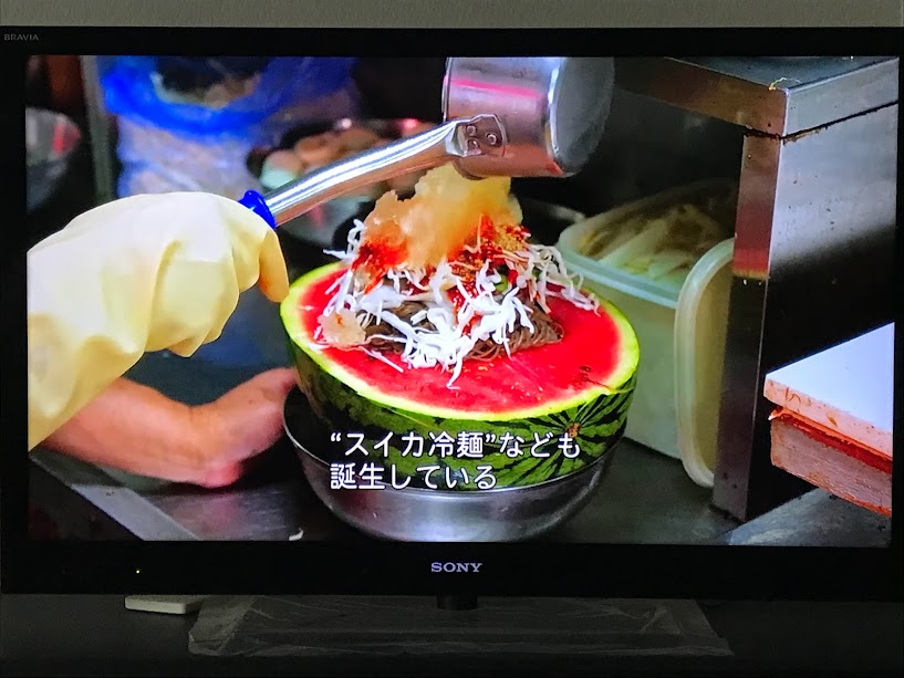 スイカ冷麺はさすがにびっくりしたじゃ。スイカをくり抜いてよぉ、その中に冷麺を入れとんがやぜぇ?これは衝撃的な冷麺やちゃね…。