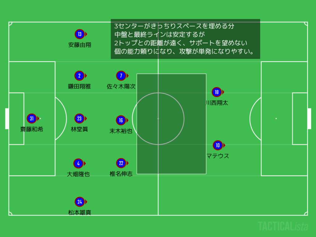 こういうのを回避するためによぉ、マテウスやったり、川西やったり、片方が下がることがあるがやけど、これをやることによって、逆にカウンターを仕掛けにくくなってくるながで、これはこれで難しいところやちゃ。ただ、これはこのシステムを採用していく上でよぉ、受け入れないといけないところやないかと思うのう。