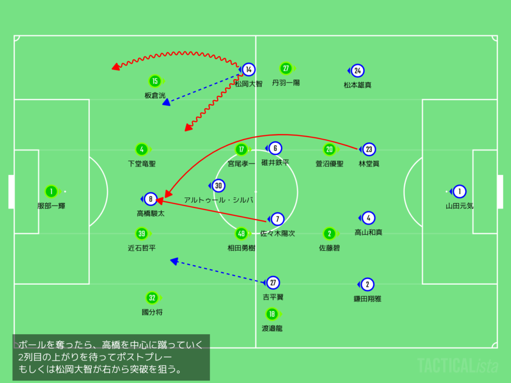 これまでの4試合やったら、安藤由翔が2トップのような形になっていたがで、彼もまたボールを受ける役割を担っていたり、はたまたマテウスや松岡大智にあずけて運ばせるなどしとったがいど、安藤やマテウスがいない中やと、どうしても高橋駿太への依存度が高まってくるのは、試合を見てても感じたところやちゃ。