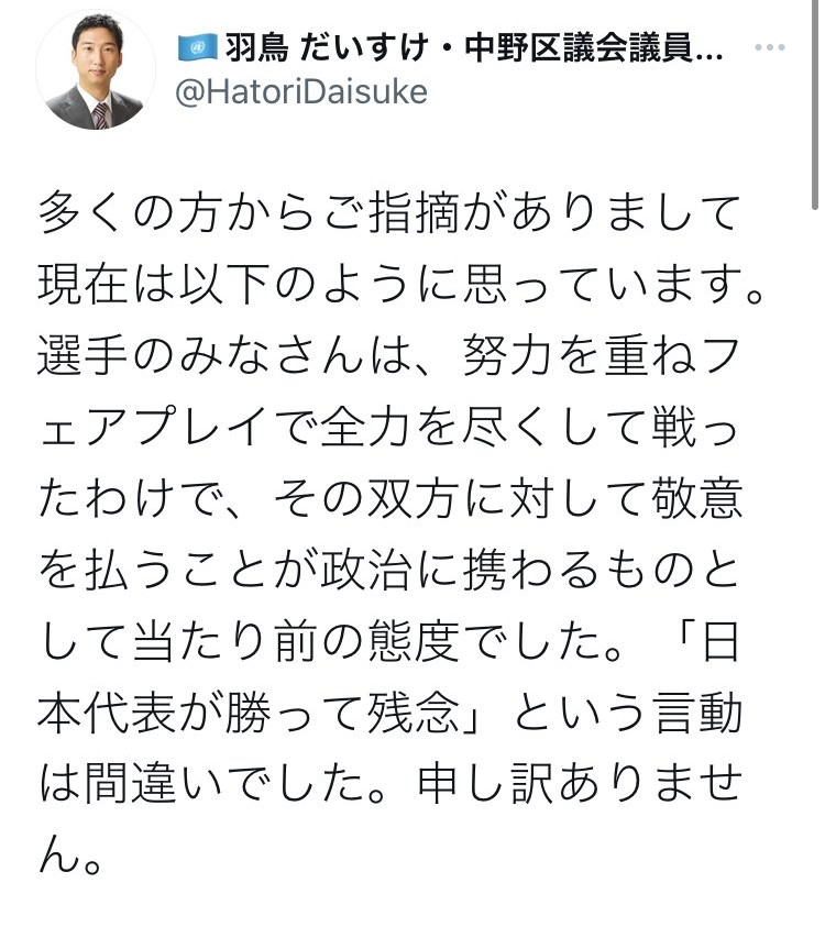 ただよぉ、羽鳥さんは「日本が勝って残念」と発言した以上は、やはりどういった意図をもって発言していたのか、正直に言ってほしいところやしよぉ、自分の言動をしっかりと振り返ってほしいと思うがやね。それをやらないで「努力を積み重ねてフェアプレイで全力で」と言葉を並べて取り繕うとしとっても、そりゃ「平謝り」としか見えんがやね。