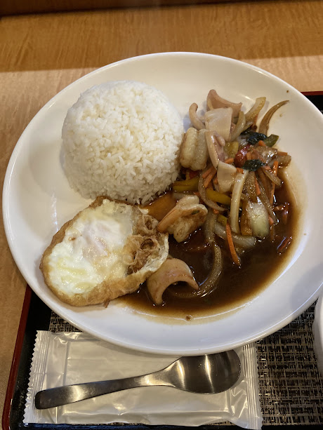 タイを代表する料理といえば「ガパオライス」やけど、これのシーフード版が「ガバオタレー」ながいちゃね。ガバオという葉っぱを魚介類と一緒に炒めてよぉ、ナンプラー、ソイソース、オイスターソースらと一緒に絡めてよぉ、ご飯と目玉焼きと一緒に提供する料理やちゃ。これにサラダ、スープ、デザートがついたセットながいちゃ。